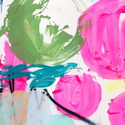 "تعمل مع طبقات وألوان متعددة، مما يخلق أعمالًا تتميز بتعقيدها وعمقها. تندمج أسطحها الملموسة والطلائية مع مناطق من العشوائية الظاهرة حيث تم رشق أو تقطير الطلاء مع مناطق من الدقة، حيث تم تطبيق الطلاء بيد مدربة ومتعمدة."