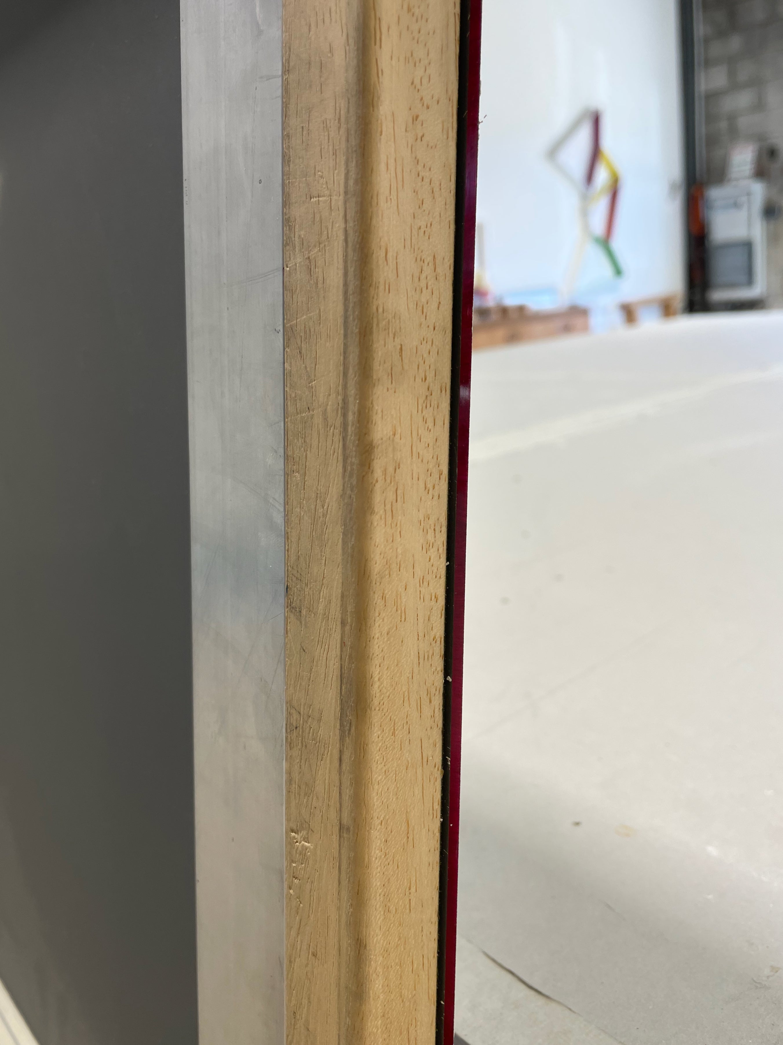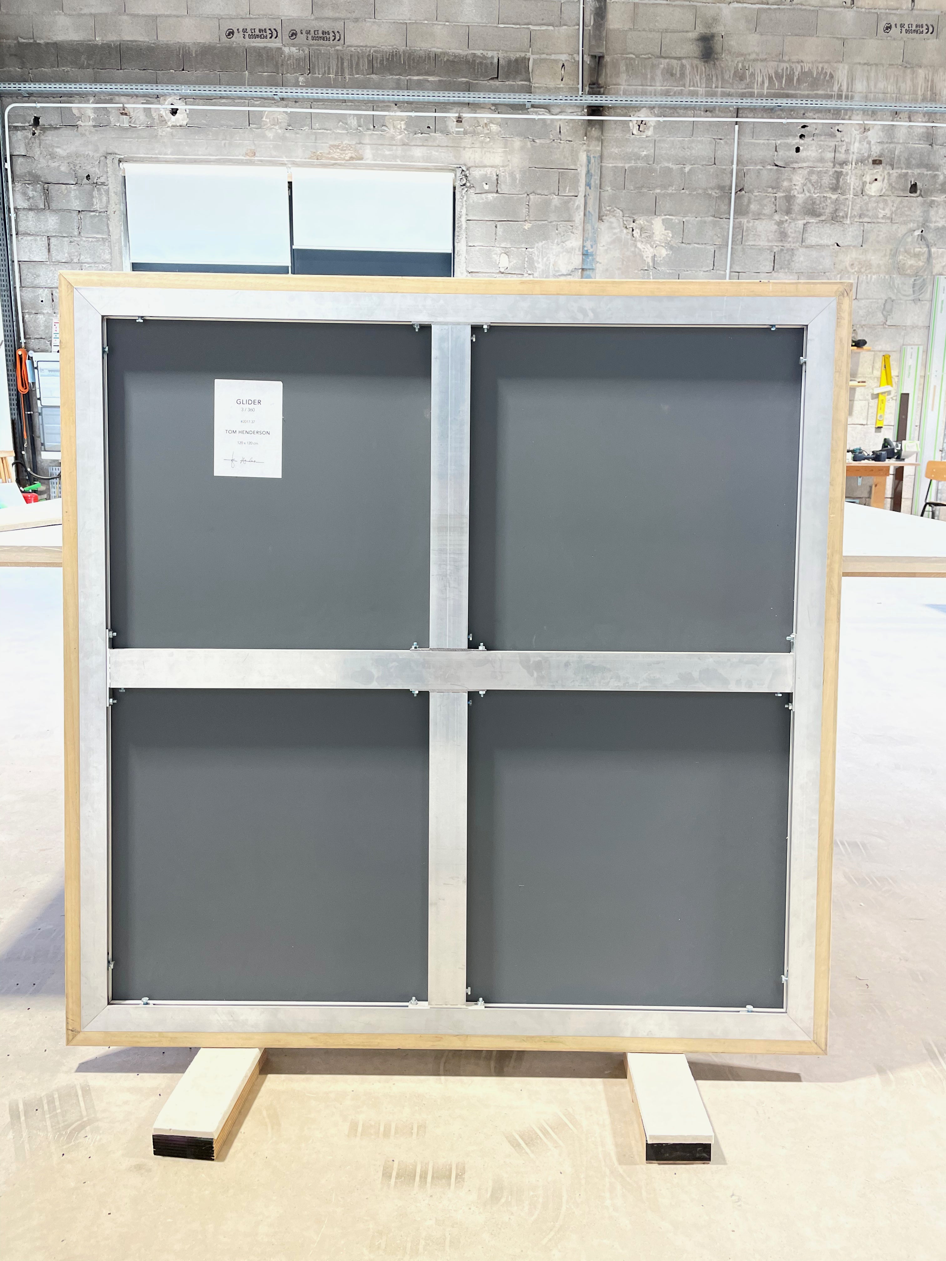 Et 3 mm ark plexiglas er monteret på en malerramme ved hjælp af industriel dobbeltklæbende VHB tape. Rammen er 18 mm tyk og er lavet af aluminium og træ. Denne ramme glider ind på en vægmontering for nem installation.