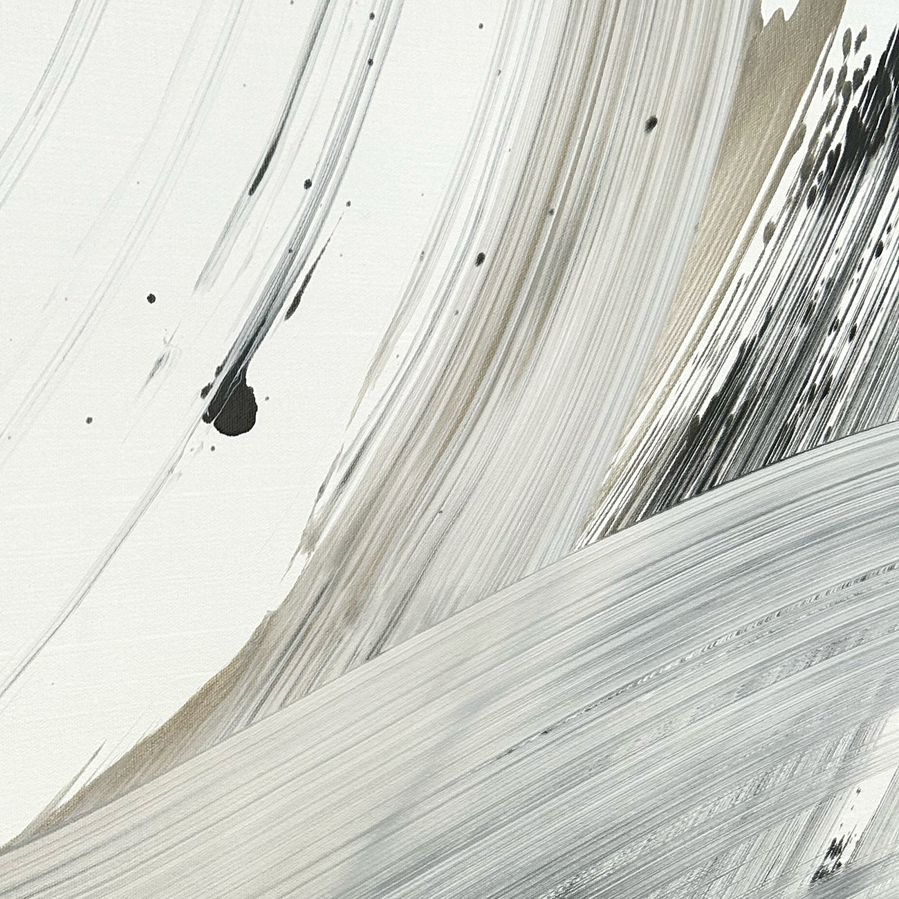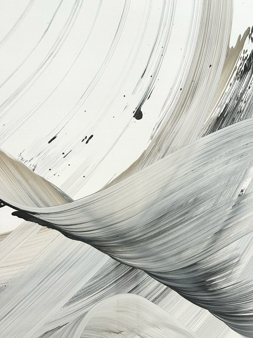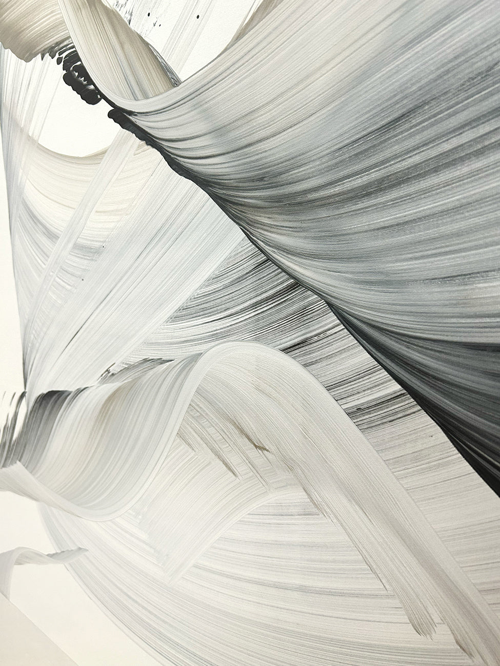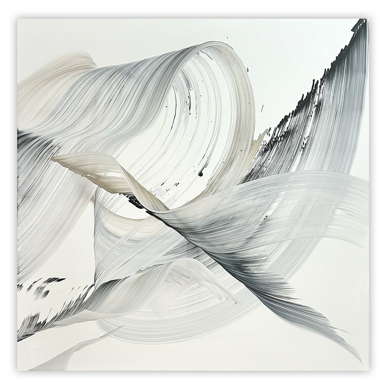 Acrylfarben, Sprühfarbe und Harz mischend, verwendet Schizas eine Vielzahl von Methoden, vom Sprühen, Gießen und Tropfen von Farbe direkt auf die Leinwand bis hin zur Verwendung einer Mischung aus traditionellen Pinseln und unkonventionellen Werkzeugen wie Spachteln, um sweeping, gestische Striche zu erzeugen.