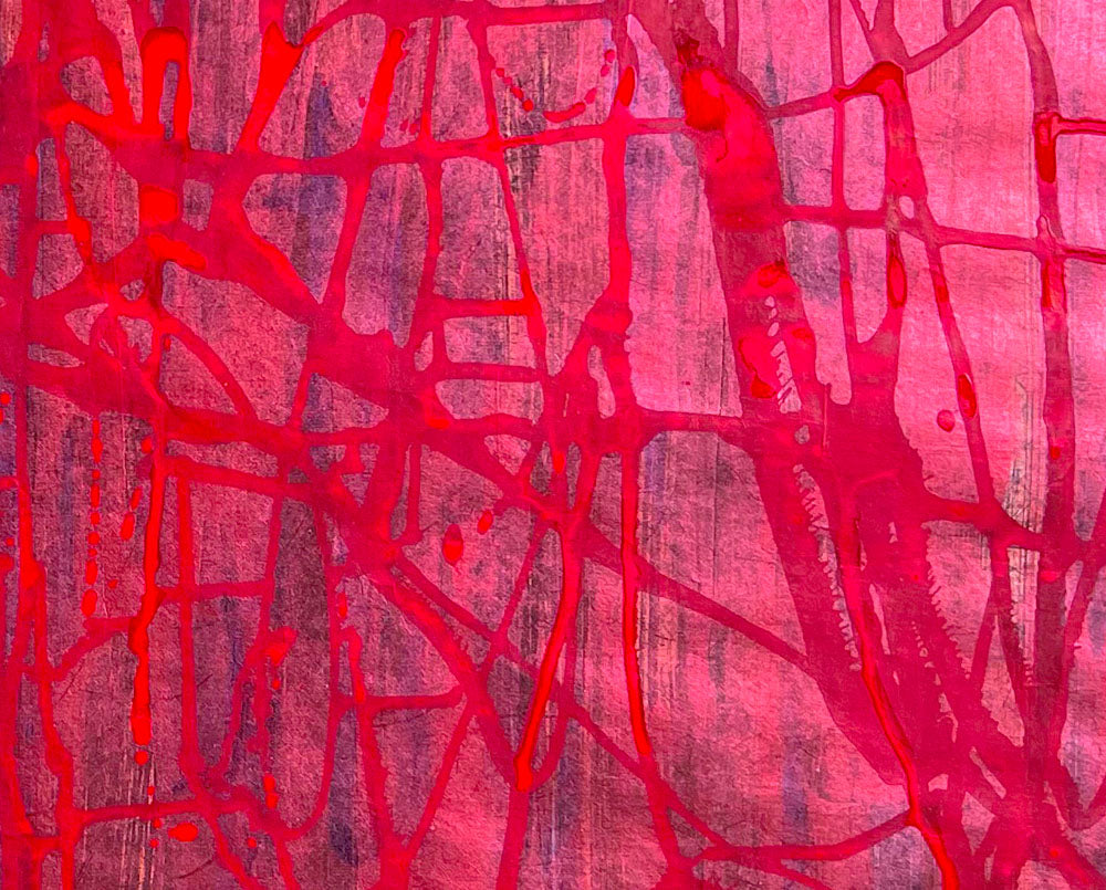 Su trabajo en mylar evoluciona a lo largo de un período de tiempo más largo. Usando una mezcla de tinta y medios a base de agua, crea composiciones abstractas, expresionistas y en capas, a menudo utilizando tanto el frente como la parte posterior de la superficie semitranslúcida para añadir dimensionalidad y profundidad.