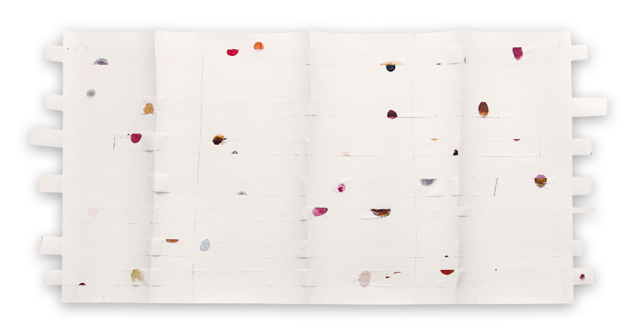 Il punto di partenza di Kröner sono due fogli di carta dipinti: un grande sfondo di carta da disegno pesante e un foglio più leggero e semi-trasparente tagliato a strisce e rovesciato in modo che entrambi i lati dipinti si affrontino.