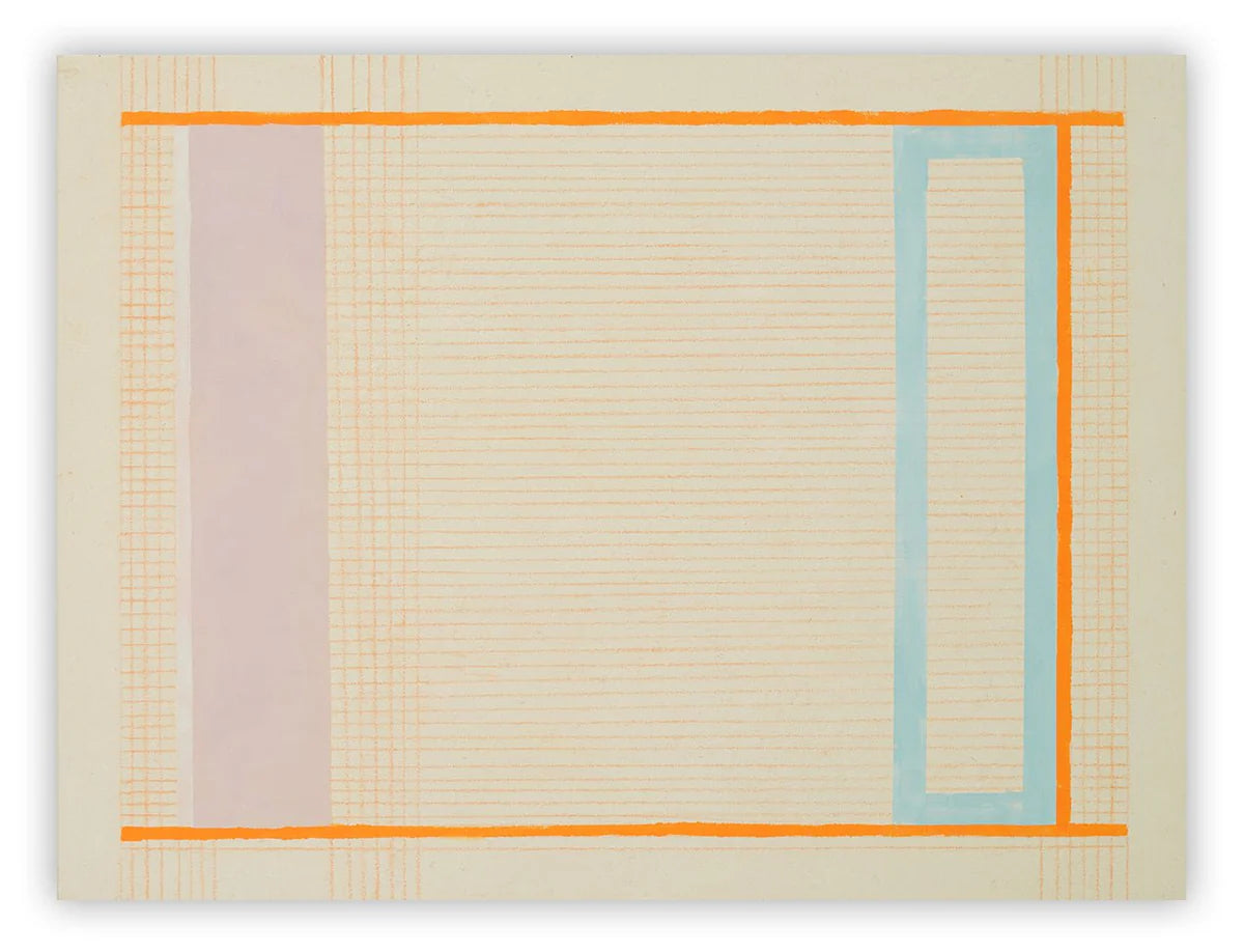 この遺産は故Elizabeth Gourlay(1961–2024)の作品に見られます。彼女の実践は決して線の硬直性についてではなく、その共鳴についてでした。視覚的な音楽を求めた初期の先駆者たちと同様に、Gourlayの構成は楽譜として機能しました。しかし、Malevichが急進的なゼロポイントを求めたのに対し、Gourlayは瞑想的な蓄積を見出し、色とトーンの微妙な変化を使って、構築されたのではなく成長したように感じられる幾何学、設計図ではなく「心の状態のグラフ」を作り出しました。