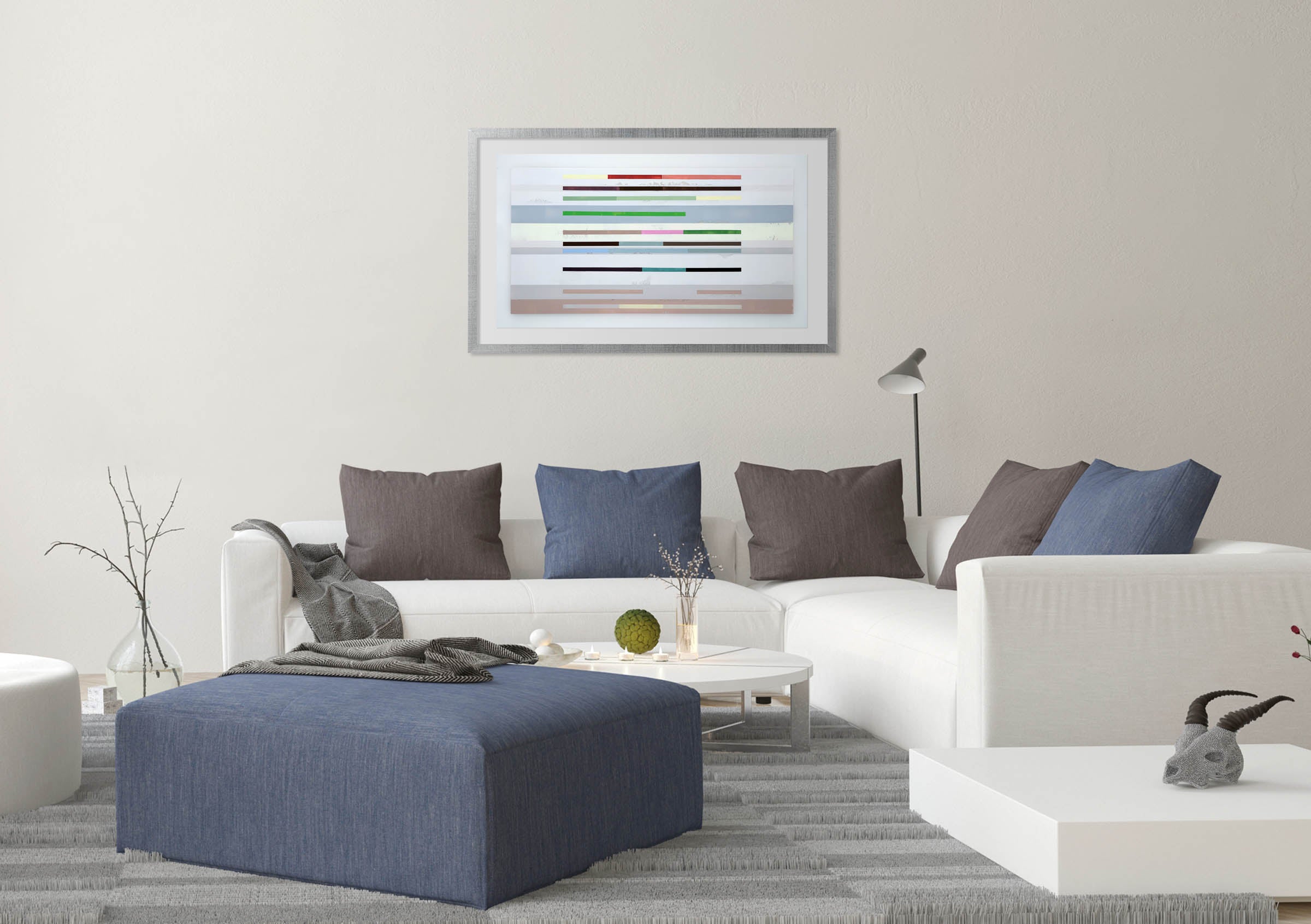 その結果得られた作品は、数学に基づき、幾何学と色彩を通じて探求された時間の中の特定の空間や物体の抽象を提示します。