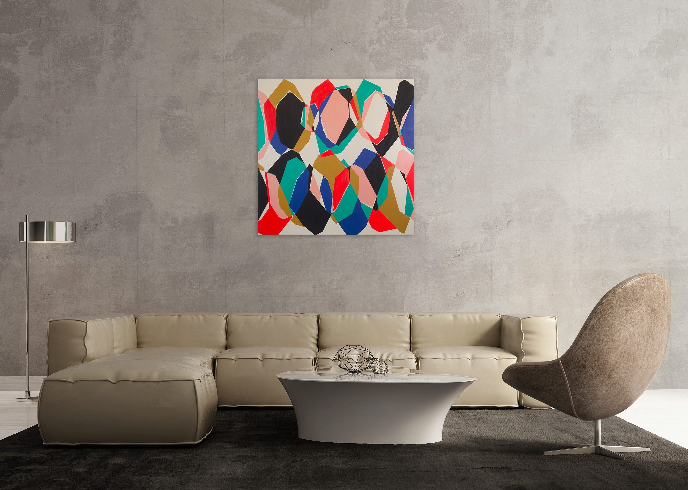 作品の中の調和と緊張は、色、パターン、幾何学的および有機的な形状との間の異なる関係から生じています。