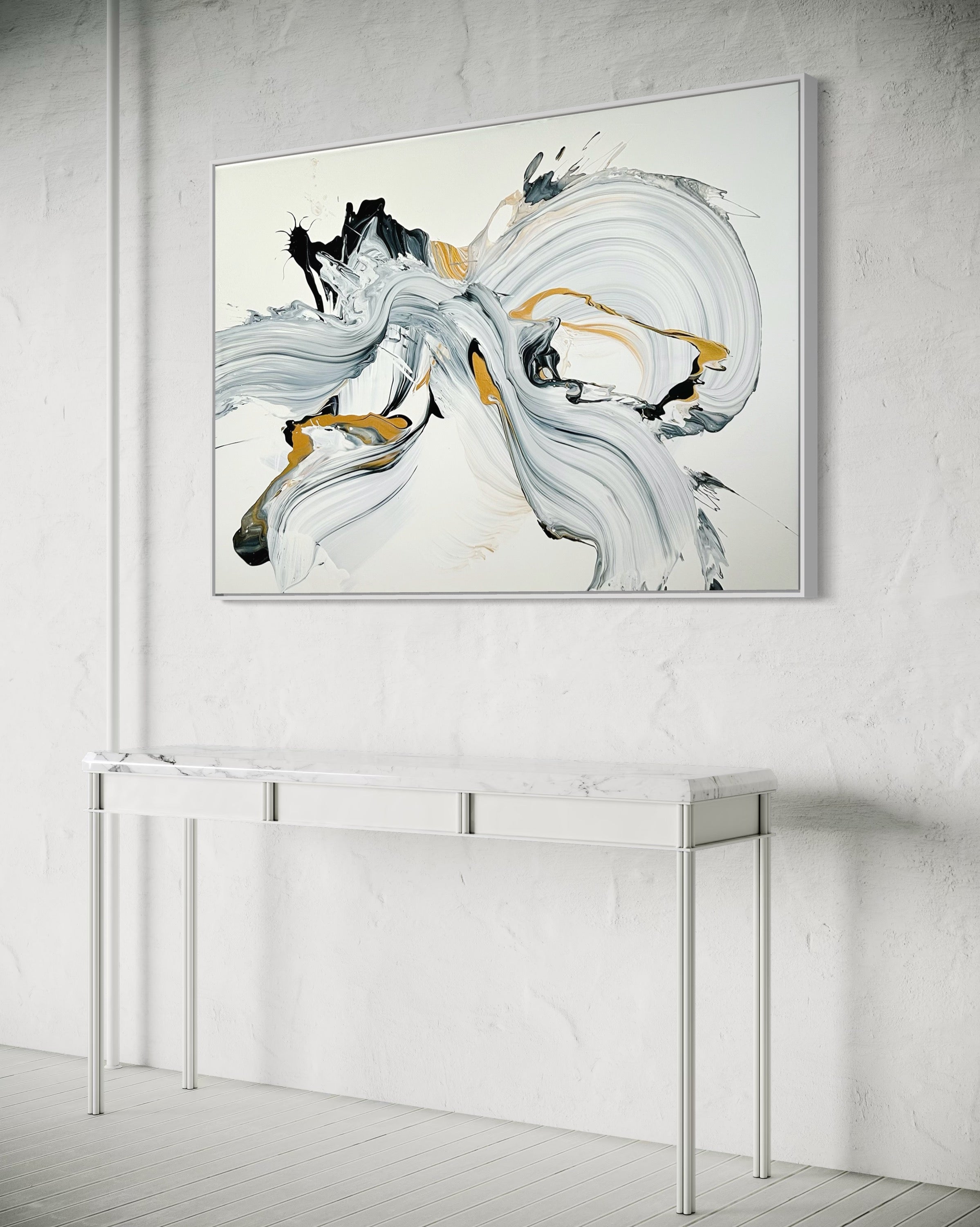 アクリル、スプレーペイント、レジンを混ぜ合わせ、Schizasはスプレー、注ぎ、キャンバスに直接滴らせる方法から、伝統的な筆とスパチュラのような非伝統的な道具を使って大きくジェスチャー的なマークを描く方法まで、さまざまな技法を駆使しています。