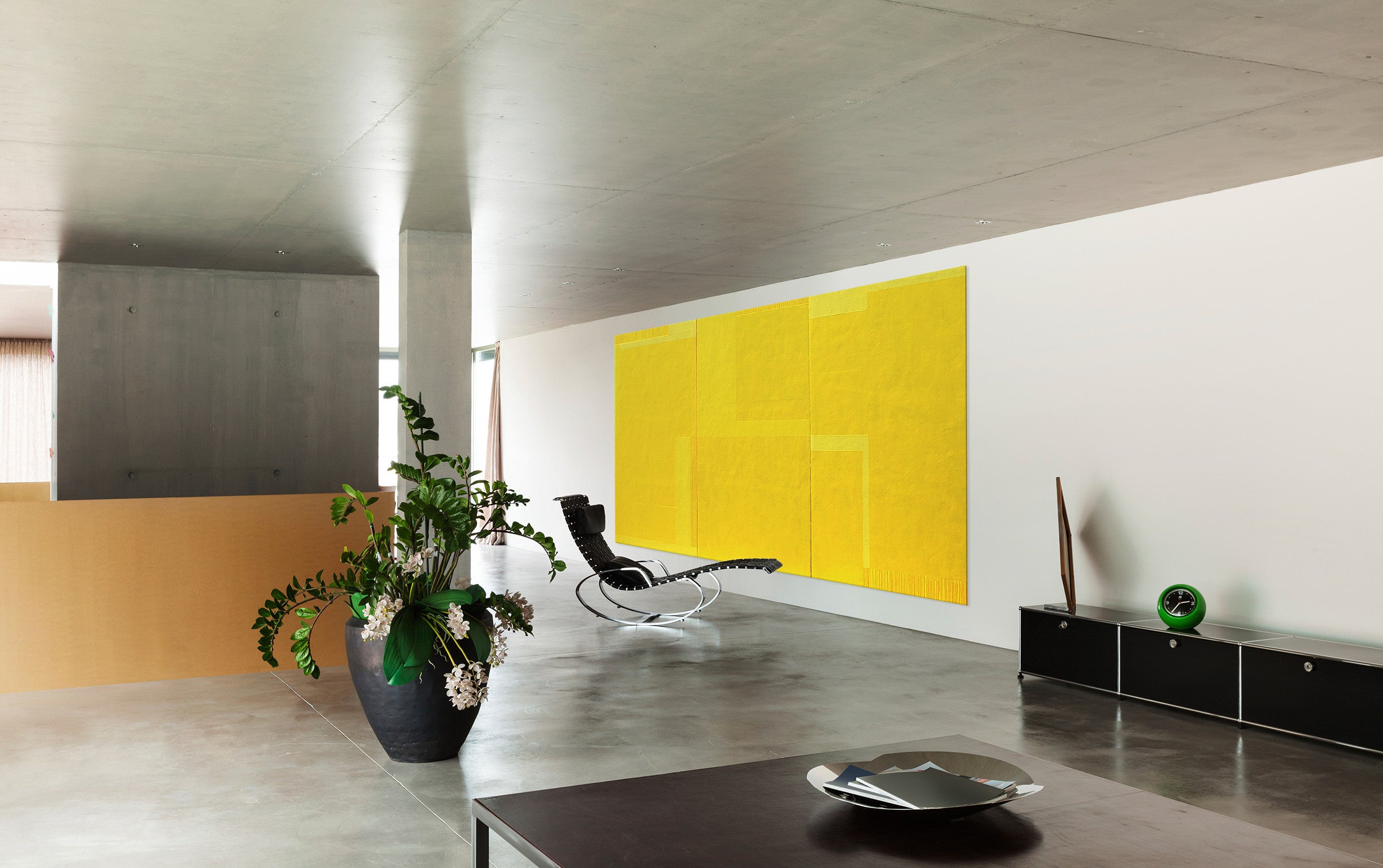 前景の重なり合う形状の緊張感と対照的な背景処理は、構図を観客に向かって押し出す高明度の黄色によって強調されています。