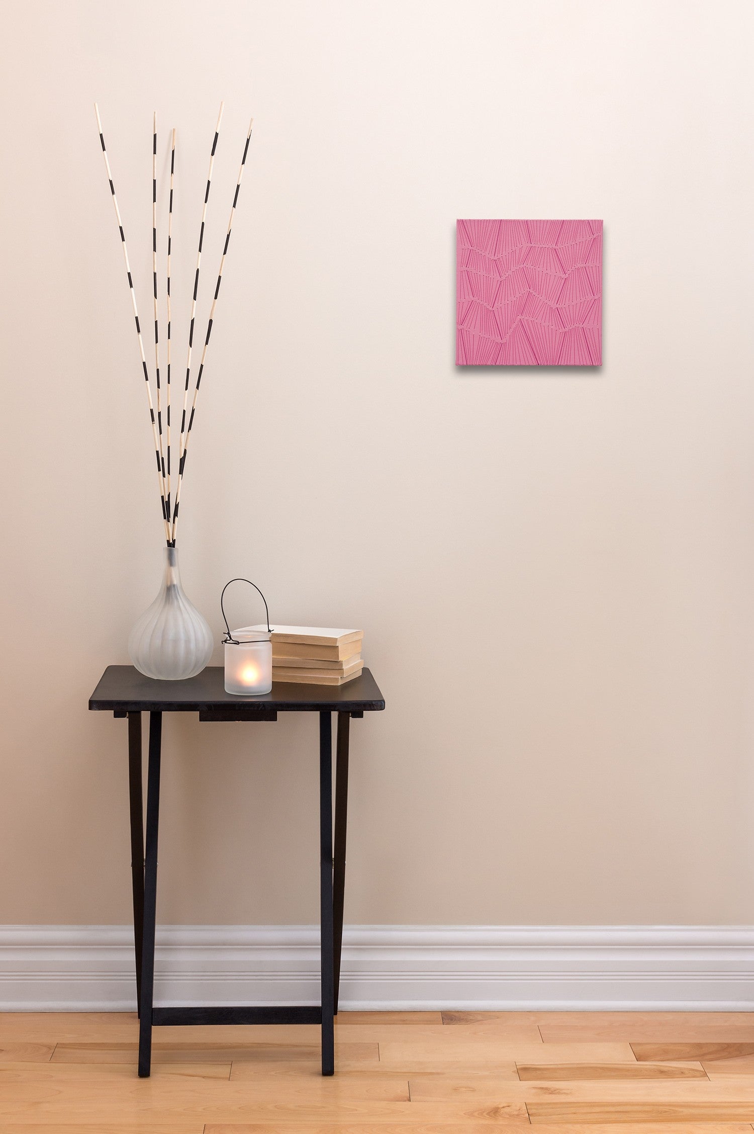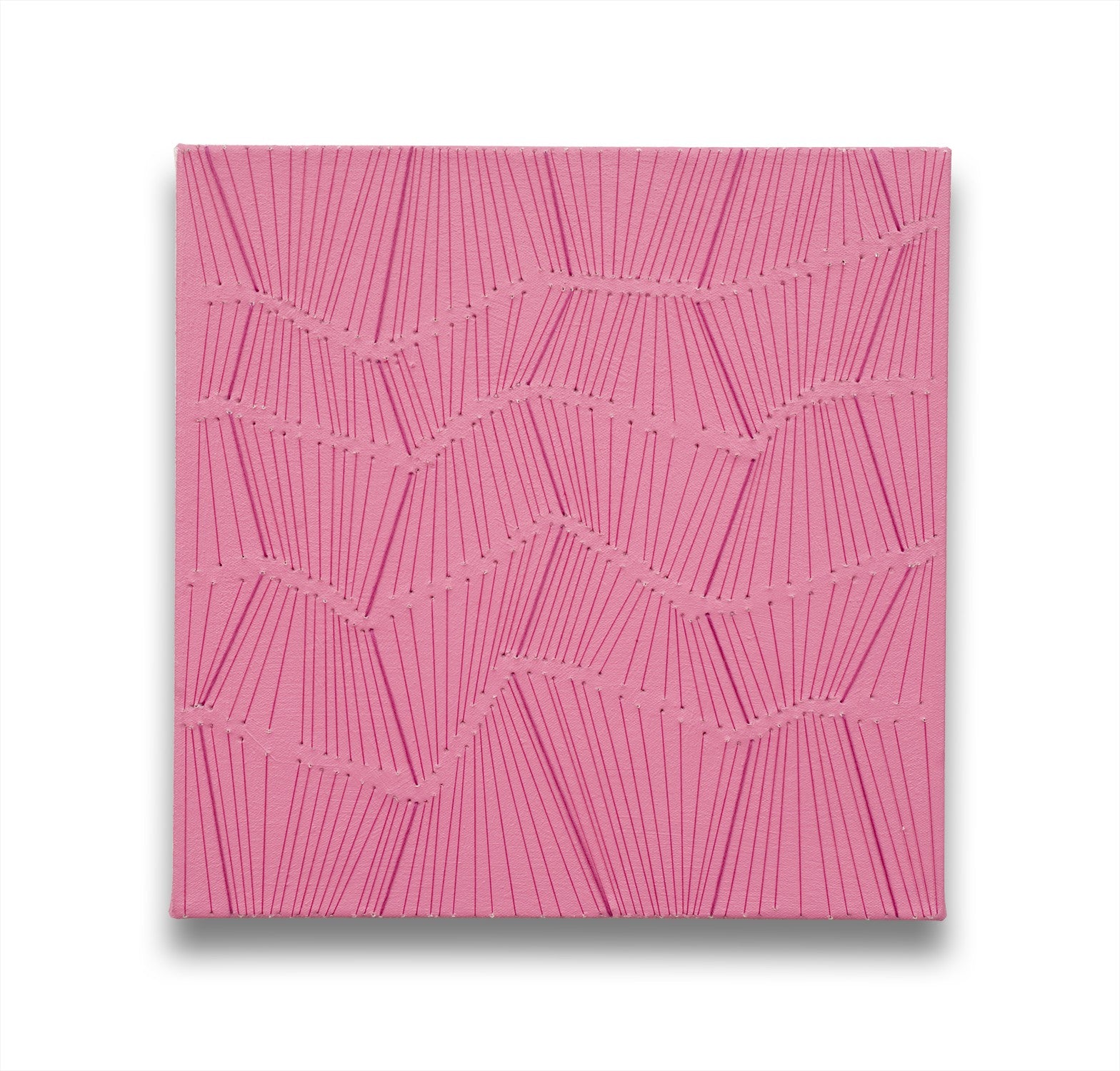 이 작품은 Bulge 시리즈의 일부로, 단색으로 칠해진 표면을 가로지르는 리드미컬한 수직 스레드 패턴입니다.