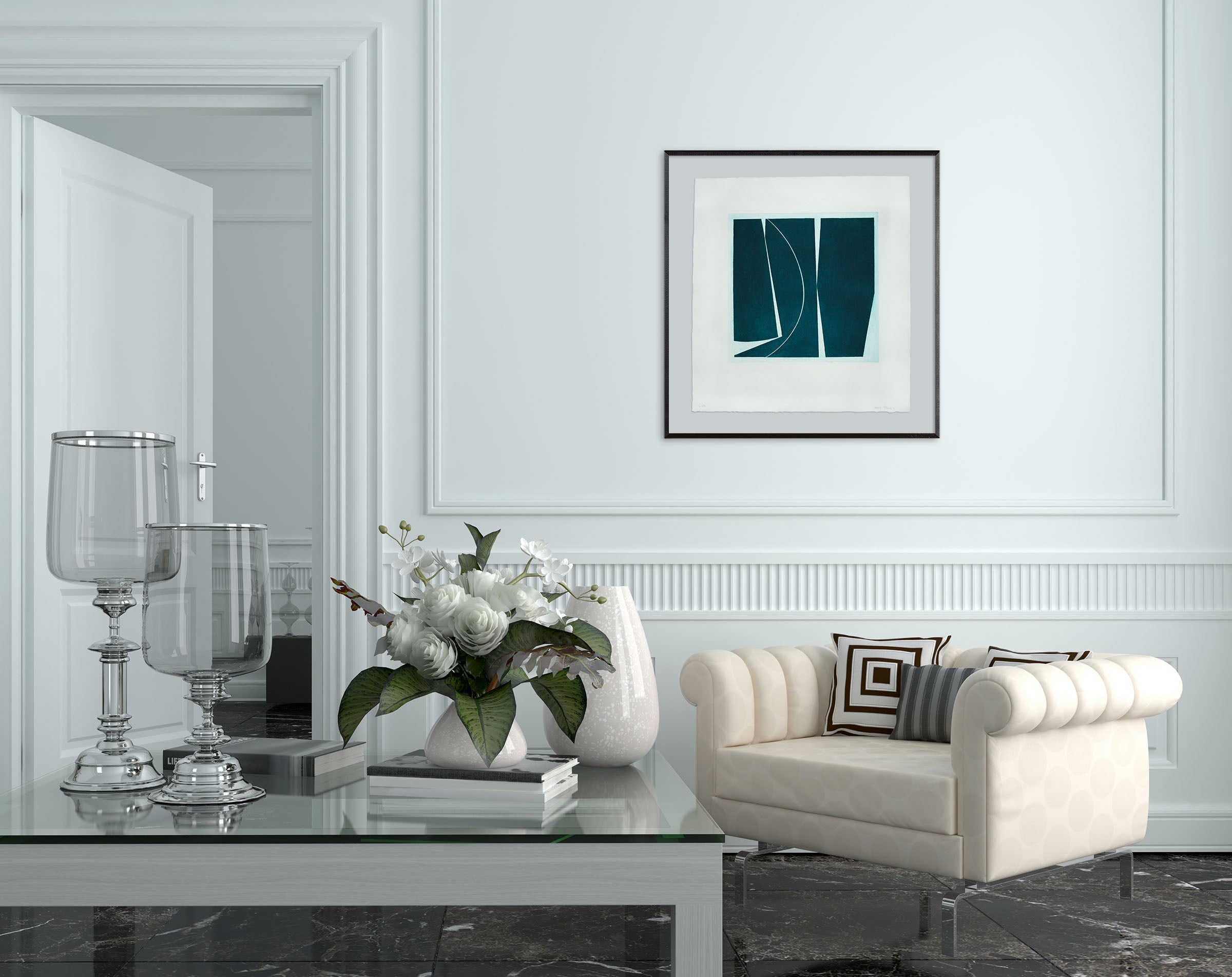 그녀의 단일 색상 사용은 배경과 전경 관계의 상호작용을 강조합니다.