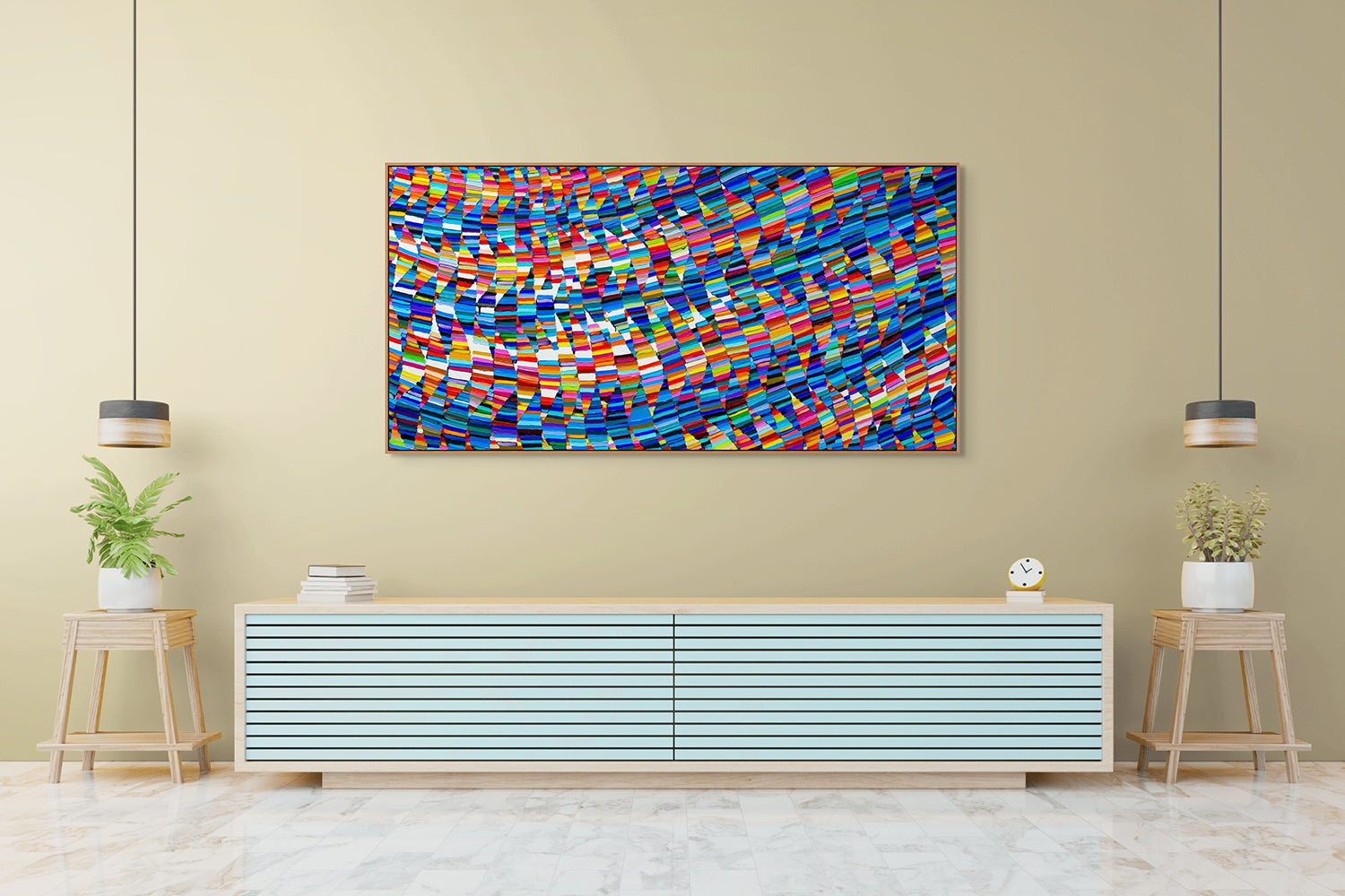 Ved å bruke rene, ugjennomsiktige farger, projiserer hun en dristig og levende energi fra komposisjonene sine. Hver nøye plassert markering griper tak i sin nabo, og danner hypnotiske former og figurer som ser ut til å vibrere.