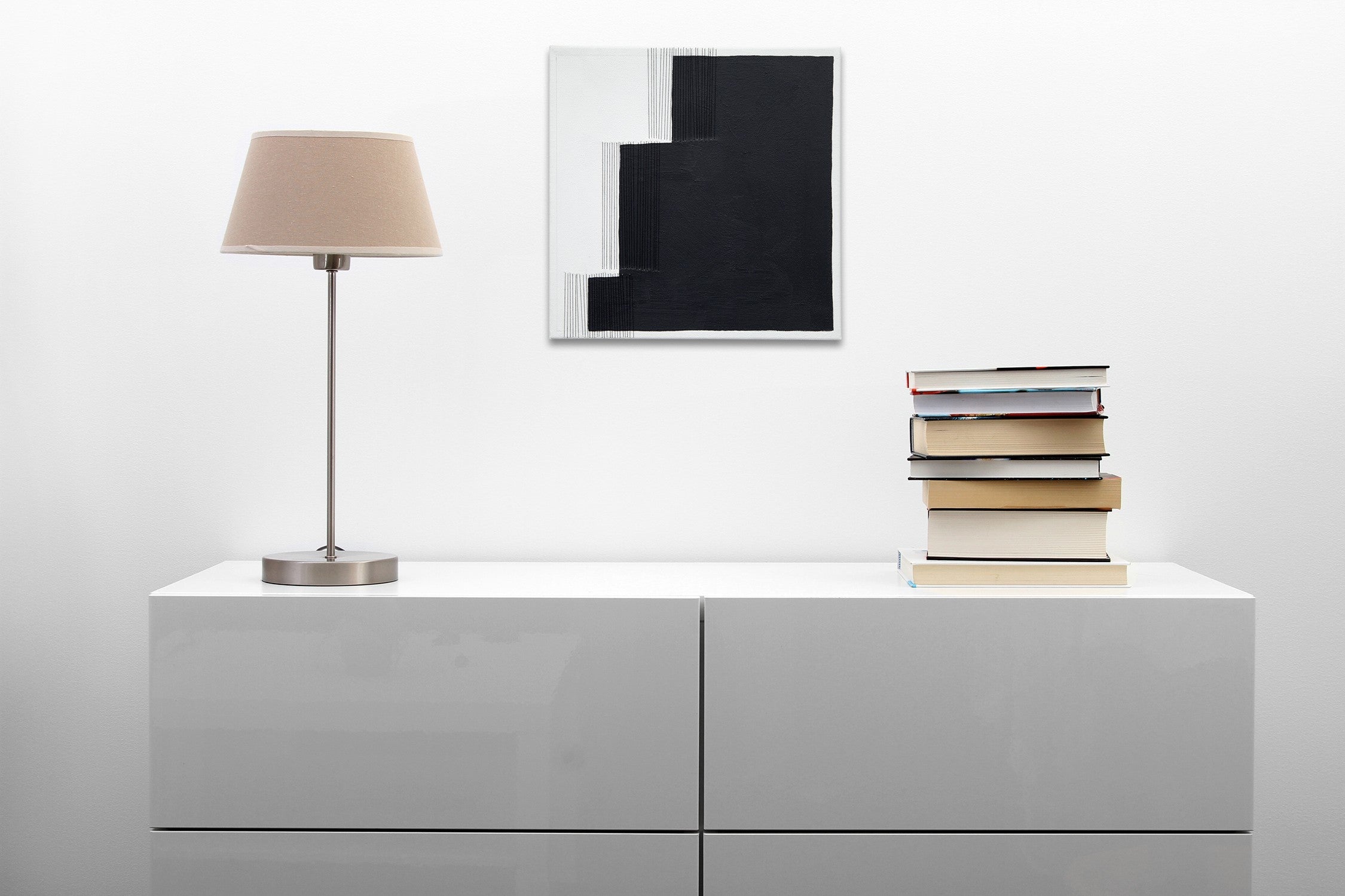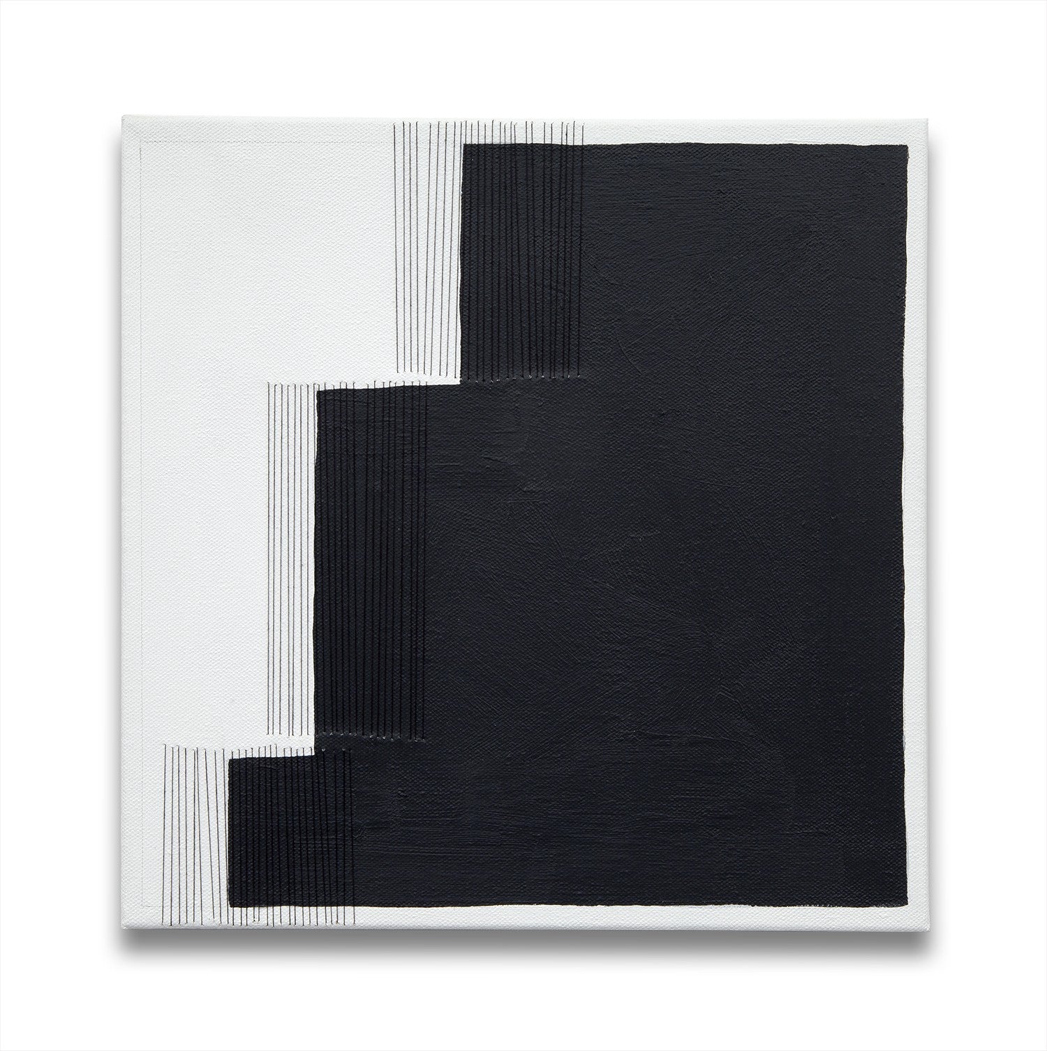 All artworks on IdeelArt are original, signed, delivered directly from the artist's studio, and come with a certificate of authenticity.De trådade linjerna antyder en fysisk barriär som avbryter formerna och hindrar dem från att kopplas samman, och samtidigt skapas en transparens som gör att betraktaren kan gå in genom linjerna på den målade ytan.