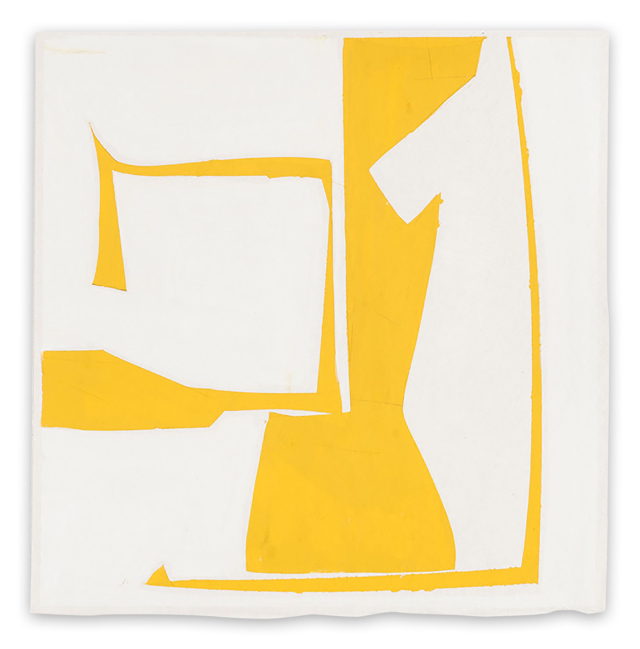 她使用膠帶來遮蔽形狀並運用硬邊緣,隨性地工作,先放下一個形狀,然後在其上進行構建。